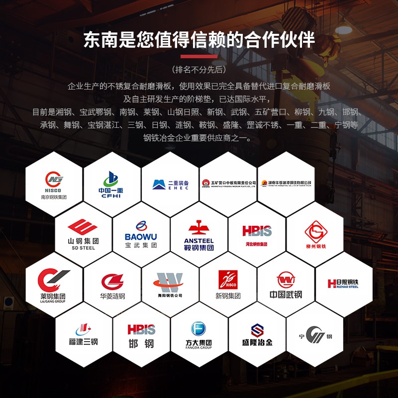 溫州東南工業機械實業有限公司創辦于1994年,是一家集研發、制造、銷售、安裝服務為一體的冶金設備配套制造企業。企業專業從事冶金設備及各種非標件等產品的科研、國產化開發、生產、安裝服務的現代化高新科技企業。并在2006年公司憑著卓越的市場開拓能力和良好的產品銷售業績與科研單位合作研制開發了:軋機機架與軋輥軸承座之間不銹復合耐磨滑板、剪機高性能滑板系列、自潤滑耐磨板、高壓除鱗閥及標印機零部件的國產化,并經多家企業投產使用。不銹復合耐磨滑板完全達到可以替代國外公司原裝廠配件的使用壽命。并對軋機階梯墊進行改進。階梯墊基板材料采用DNTZ-80合金鋼鍛件,在階梯墊硬面層采用耐腐蝕高耐磨合金材料熔焊焊接工藝。 產品具有良好的抗沖擊性,高耐磨性,耐腐蝕性及力學性。是原階梯墊使用壽命3倍以上,至今已擁有十分成熟的制造技術,并且得到國內鋼鐵企業的認可和好評。